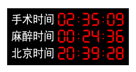 | 1、自身精度:±0.5s/d。 2、工作温度:-10~+50℃;相对湿度:≤95%。 3、供电电压:220VAC,50HZ。 4、支持串口对时或网络NTP对时协议;NTP对时精度:1~10msms,串口对时精度:1~100ms。 5、特制2.3寸高亮LED数码管三联显示手术时间、麻醉时间、北京时间。 6、LED发光强度≥1200mcd,LED刷新速度≥150帧/秒。 7、外框采用超薄黑色铝合金机箱,磨砂PC面板,防眩光,不刺眼。 8、外形尺寸:630mm×320mm×55mm(单面)/630mm×320mm×85mm(双面)。 9、平均无故障时间(MFBF):≥5万小时。 10、计算机远程开启显示屏,关闭显示屏,集中管理,点对点监控。 11、计算机远程控制显示屏夜间白天亮度自动调节。 12、配套计时控制器:工作电压:DC5V;工作温度:-35~+70℃;相对湿度:≤95%;;传输距离:12米;外形尺寸:130mm×35mm×30mm;安装方式:壁挂式;具备4个操作按键,2个工作状态灯,1个红外接收器、1个温湿度采集器;正计时、倒计时等。 |